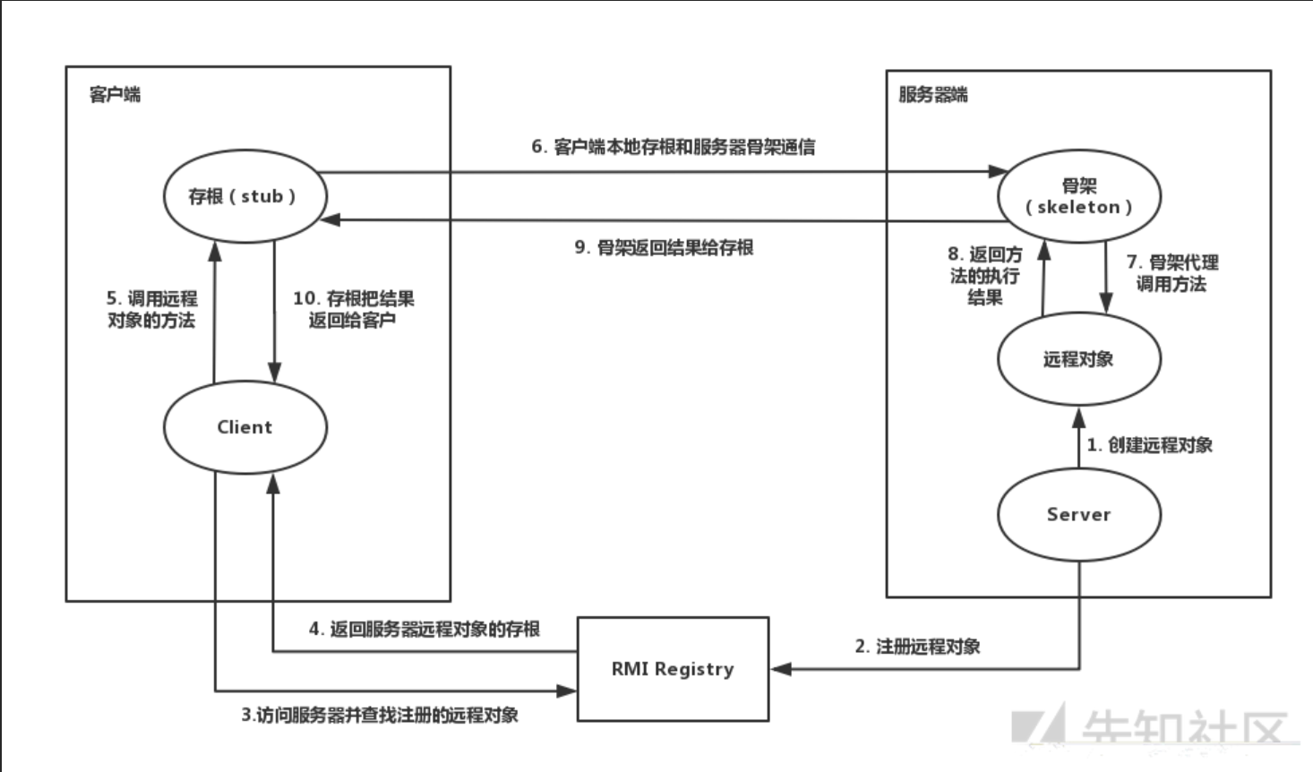 骨架(Skeleton):读取客户端传递的方法参数,调用服务器方的实际对象方法, 并接收方法执行后的返回值;